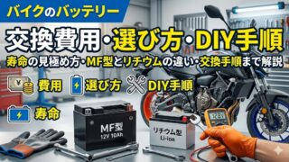 バイクのバッテリー交換費用・選び方・DIY手順を解説。寿命2〜3年の見極め方・MF型と開放型とリチウムイオンの違い・型番の選び方・端子の外す順番・交換後の充電器の必要性までまとめました。