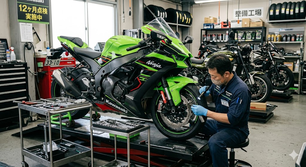 大型バイク(400cc超)は点検項目が多く、250cc以下より高くなる傾向があります。ZX-10Rのような大型SSは工賃10,000〜15,000円前後が目安です。
