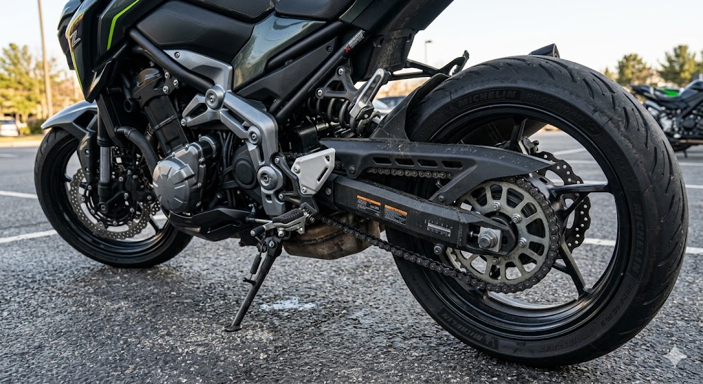⚠️ チェーンの張り調整はアクスルシャフトのナットを緩めて行う作業で、慣れていない場合はバイクショップに依頼することを推奨します。調整が左右で均等でないとチェーンラインが狂い、走行に支障をきたします。