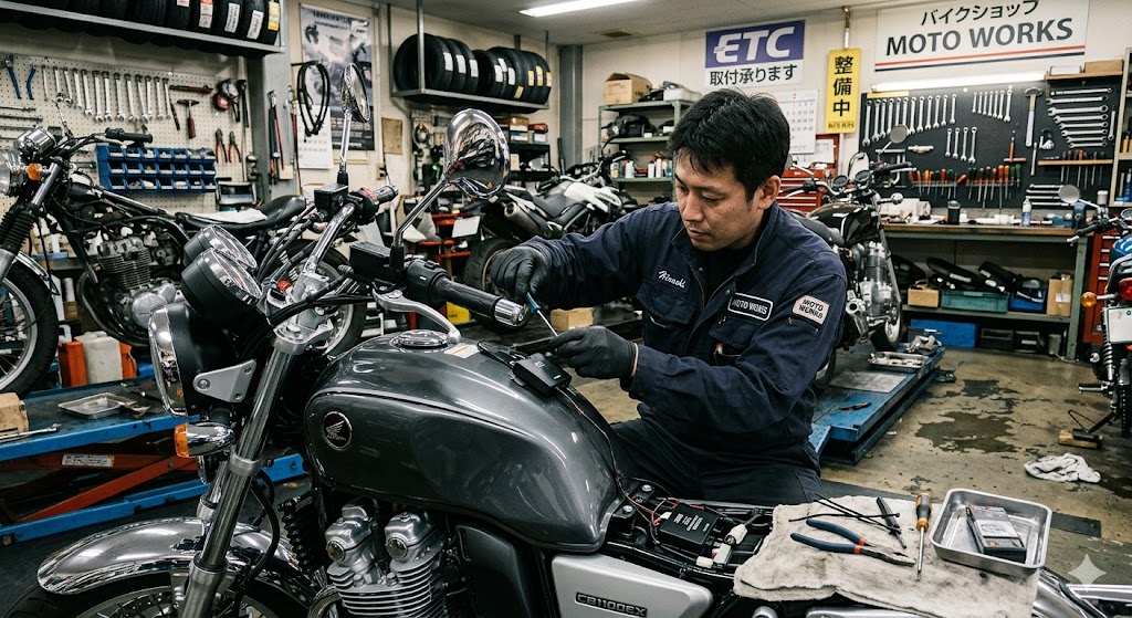 ⚠️ カー用品店(オートバックス・イエローハットなど)でもセットアップ可能ですが、**バイクへの取り付けはバイク専門店の方が確実です。**バイクの配線・固定に精通したスタッフがいるバイク専門店に依頼することをおすすめします。