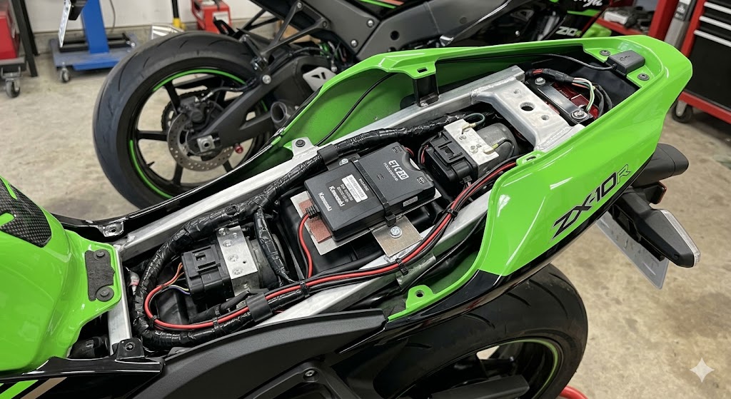 ZX-10Rは積載スペースが少なくシート下も狭いため、取り付け位置と配線ルートの検討が重要です。事前に専門店で現車確認してもらうのが確実です。