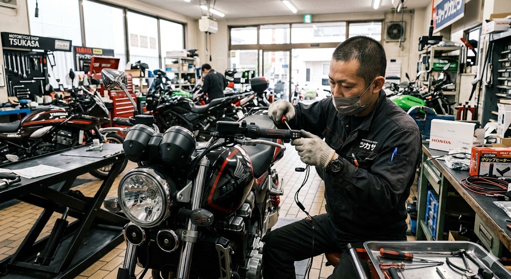 グリップヒーターはバッテリーから電源を取ります。常時電源に繋ぐとバッテリー上がりの原因になるため、ACC連動(エンジンオンで通電)の配線が原則です。電源取り出しがわからない場合もショップに相談してください。