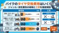 バイクのタイヤの接地面積は前後それぞれ名刺1枚程度 その小さな面積で雨水を排水しながら路面をグリップしているため、少しの操作ミスでスリップにつながります。