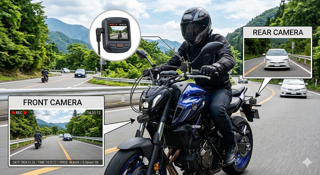 バイク用ドライブレコーダーは前後2カメラタイプが主流で、ミツバサンコーワ・ドライブマン・コムテックなどの国内ブランドが信頼性が高いです。防水・耐震性能はバイク専用を選ぶことが重要で、四輪用を流用すると振動・雨への耐性が不足します。