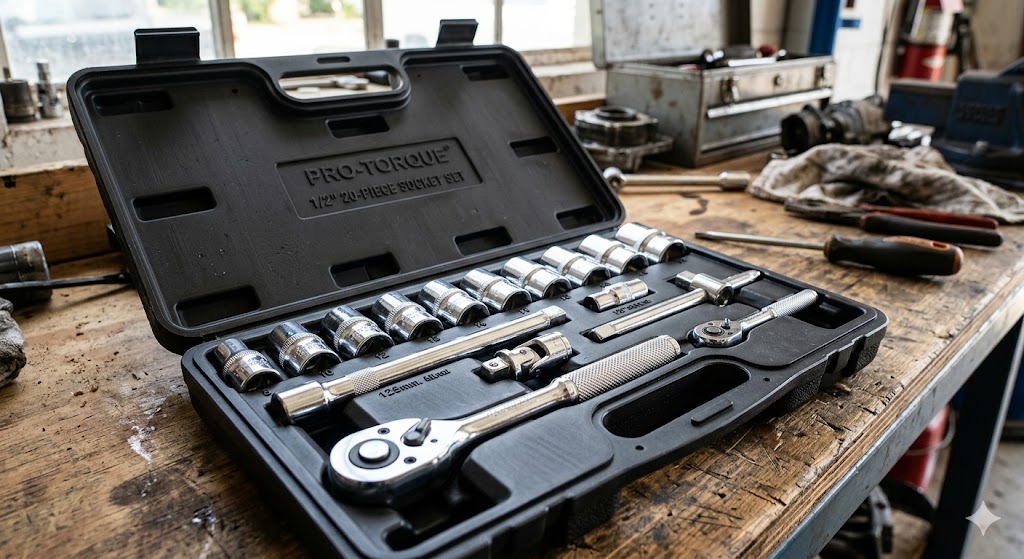 ラチェットハンドルとソケット(筒状のアタッチメント)を組み合わせて使う工具です。奥まった場所のボルトや素早く回したい場面で大活躍します。