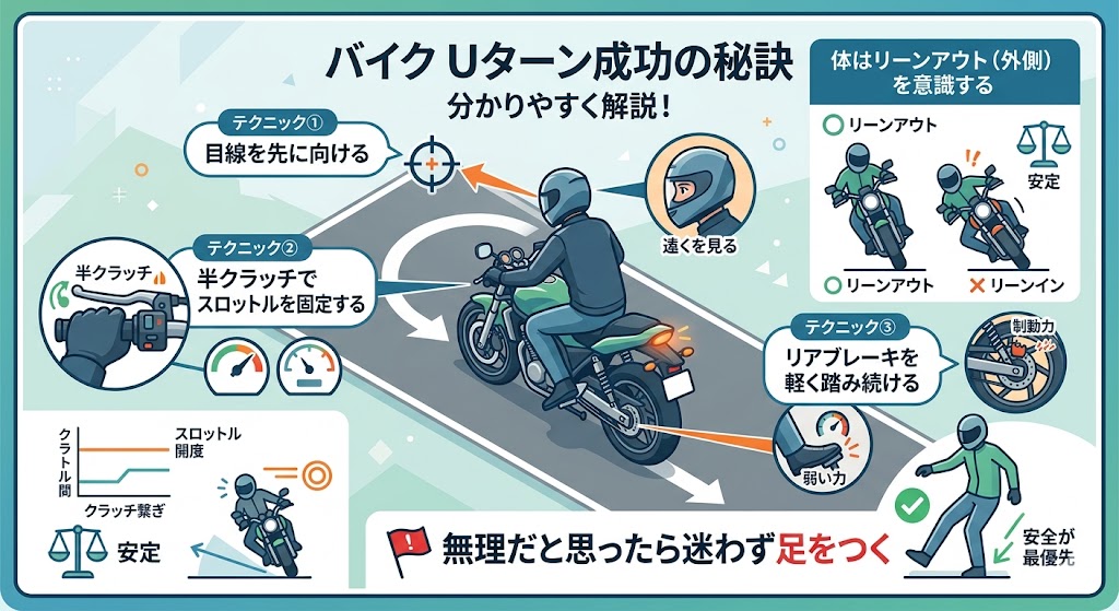 この記事ではUターンが安定しない理由・転ばないための5テクニック・3ステップ練習法・大型バイクの取り回し方を解説します。
