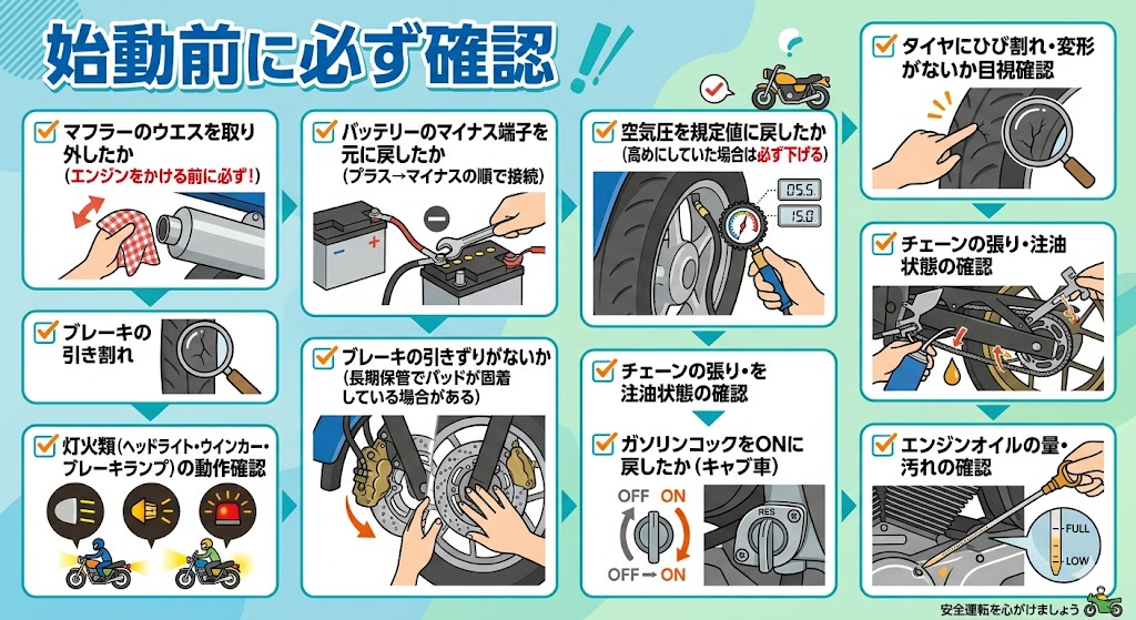 冬眠明けにそのまま走り出すのはNG。必ず以下を確認してからエンジンをかけましょう。