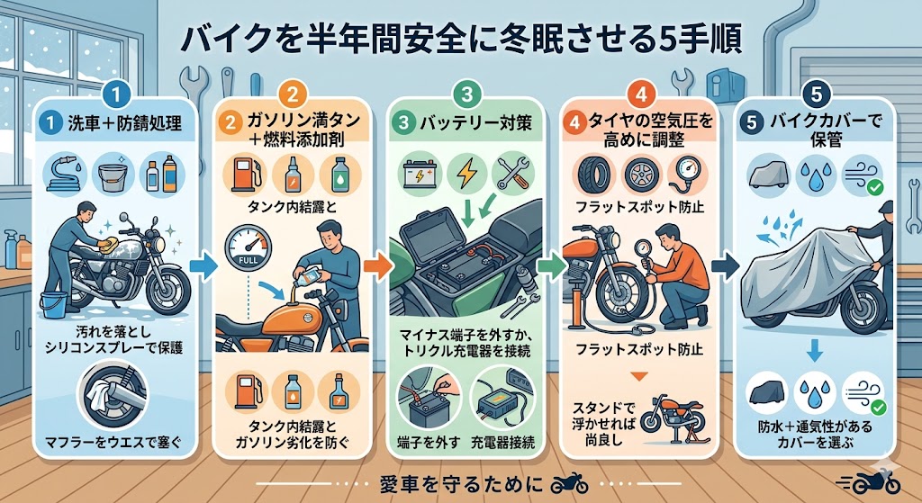 バイクを半年間安全に冬眠させる5手順をまとめると👇