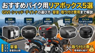 カスタム・ツーリング用品 【2026年版】バイク用リアボックスおすすめ5選|GIVI・シャッド・デイトナの選び方・容量・取り付け費用まで解説 バイク用リアボックスの選び方を解説。GIVI・SHAD・デイトナの違い・モノロックとモノキーの違い・容量の選び方・取り付け費用の目安まで、ZX-10Rオーナーが実体験をもとにまとめました。 2026.04.24 カスタム・ツーリング用品