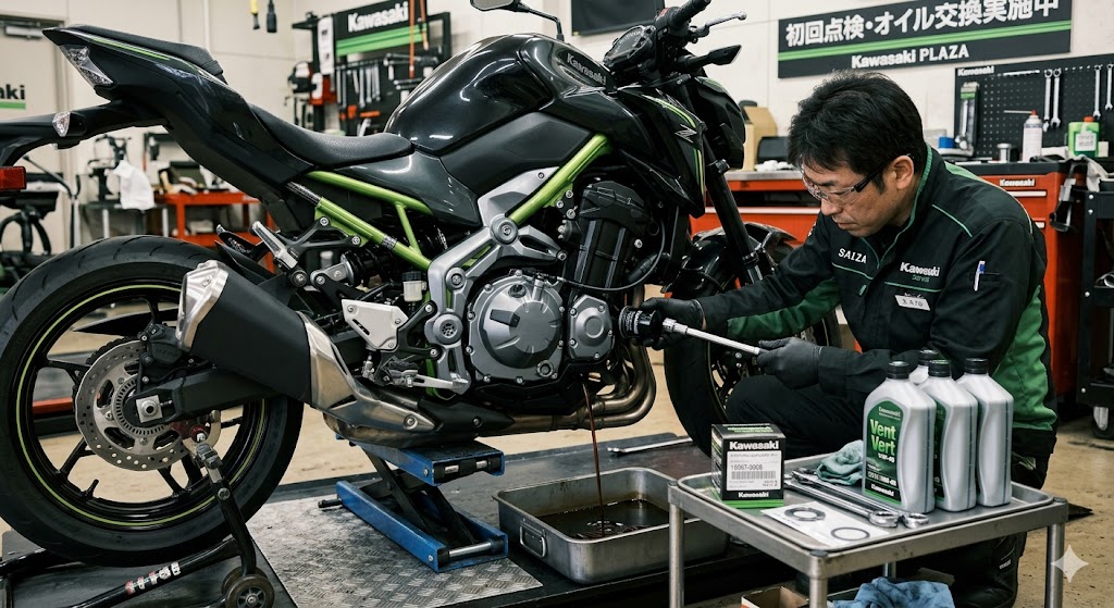 慣らし終了後は必ずオイル+フィルター交換・1ヶ月点検(カワサキ正規店・メンテナンスノート持参)