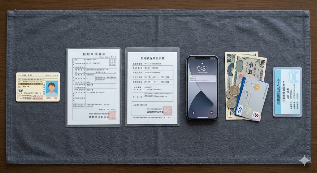 - 必携品:免許証・車検証・スマホ・現金・保険証書