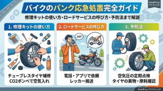 メンテナンス 【2026年版】バイクのパンク応急処置完全ガイド|修理キットの使い方・ロードサービスの呼び方・予防法まで解説 バイクのパンク時の対処法を徹底解説。チューブレスタイヤのパンク修理キットの使い方・手順・ロードサービスの選び方・パンクしにくい走り方まで、ツーリング前に知っておくべきことをまとめました。 2026.04.21 メンテナンス