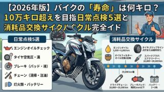 カスタム 【2026年版】バイクの「寿命」は何キロ?10万キロ超えを目指す日常点検5選と消耗品交換サイクル完全ガイド バイクの寿命は何キロかを排気量別に解説。10万キロ超えを実現するための日常点検5選と、エンジンオイル・タイヤ・チェーン・ブレーキパッド・バッテリーの消耗品交換サイクル一覧を完全解説します。 2026.04.13 カスタムバイク購入ガイド
