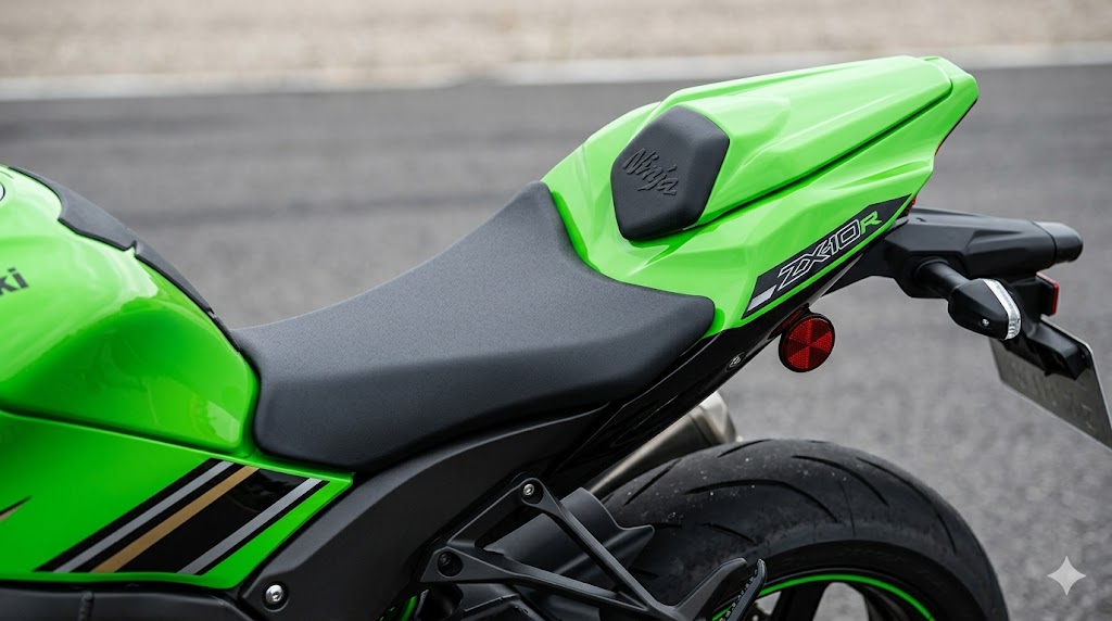 ZX-10Rはサーキット前提の設計のため、シートが非常に細身に作られています。タンクからシートにかけての幅が狭く、足を降ろしたときに内またが当たりにくい構造です。