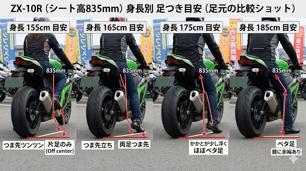 ZX-10R(シート高835mm)における身長別の足つき目安です。股下の長さによって大きく変わりますが、一般的な体型を基準にした目安として参考にしてください。